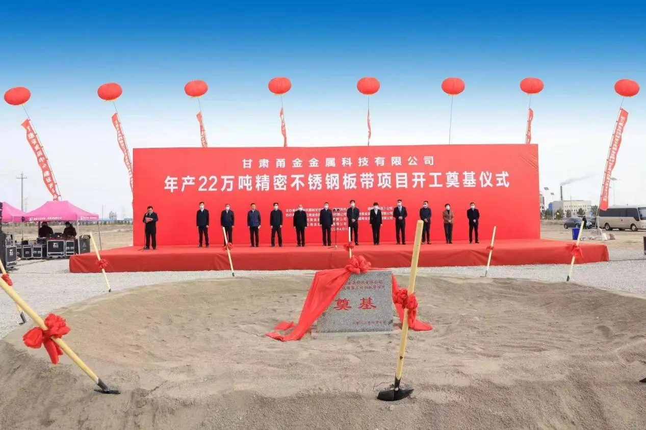 2022年4月10日,甘肃甬金年产22万吨精密不锈钢板带项目开工奠基仪式隆重举行,该项目占地199.5亩,计划投资12.28亿,建成后可实现产值19.6亿元。项目分期建设,其中一期工程计划建设期为24个月,分步建成两条精密BA不锈钢生产线,年产能18万吨;二期工程计划建设期为18个月,建成一条精密超薄不锈钢生产线,产能4万吨。